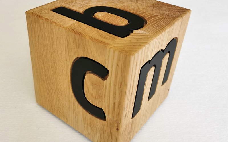 Der Grundkörper besteht aus einem verleimten Eiche Rohling, der auf unserem 5-Achs Bearbeitungszentrum zuerst umseitig per Sägeblatt auf das Endmaß formatiert und dann von allen Seiten mit Ausfräsungen versehen wurde. Anschließend ist dieser auf zwei Würfel aufgeteilt, die Kanten verrundet und die Flächen geschliffen worden. Eine darauf folgende besonders matte und dezente Lackierung schützt vor Handabdrücken. In den gefrästen Vertiefungen sind konturgelaserte Einsätze aus schwarzem satiniertem Acryl mit einer betonten Fuge eingeklebt. Ein selbstklebender gravurgelaserter Filz, der auf dem Boden montiert ist, bildet den wertigen Sockel dieser Auszeichnung.
