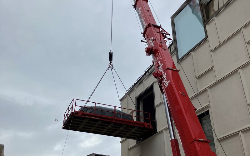 Zwei Großexponate, der HyperLoop und das Solar-Auto Bluecruiser, mussten durch das Fenster im zweiten Obergeschoss des Museums gehoben werden, aus dem zuvor die 3 x 5 Meter große Glasscheibe entfernt wurde.